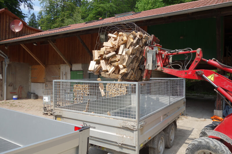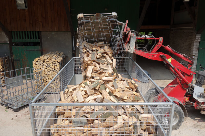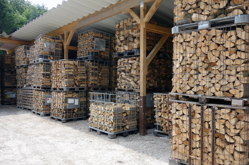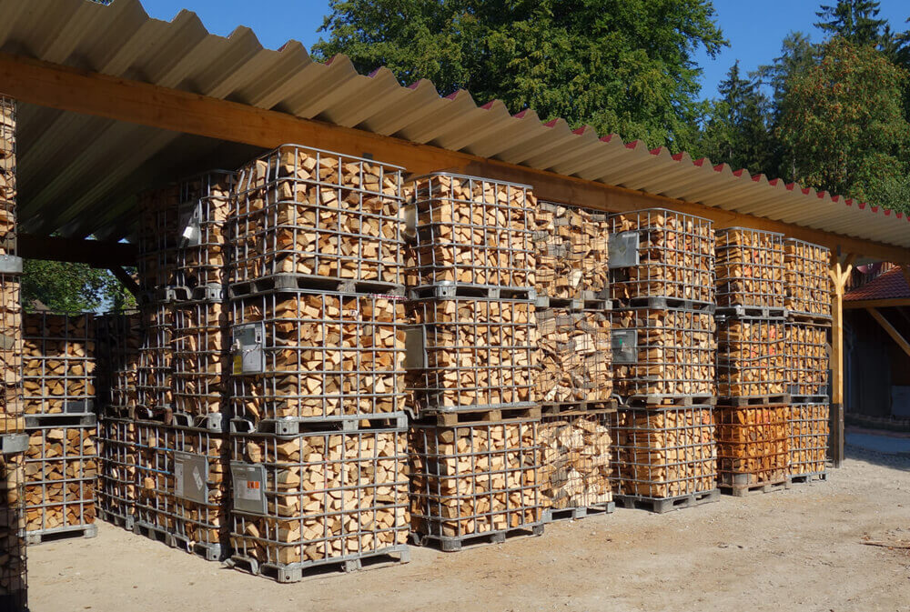 Wir produzieren das Kaminholz im Wald aus Stammholz. Das Holz wird im Wald in Meterstücken gespalten, aufgesetzt und später in Gitterboxen gestapelt und abgelängt und unter Dach gelagert.